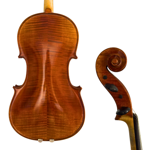 The viola features a select two-piece flamed maple back with deep, symmetrical figure, paired with a straight-grained spruce top. The oil varnish is a rich reddish-brown over a golden base, highlighting the natural flame of the maple and adding depth to its elegant finish. The Stradivari-inspired outline and arching give this model a focused tone with excellent projection and responsiveness.