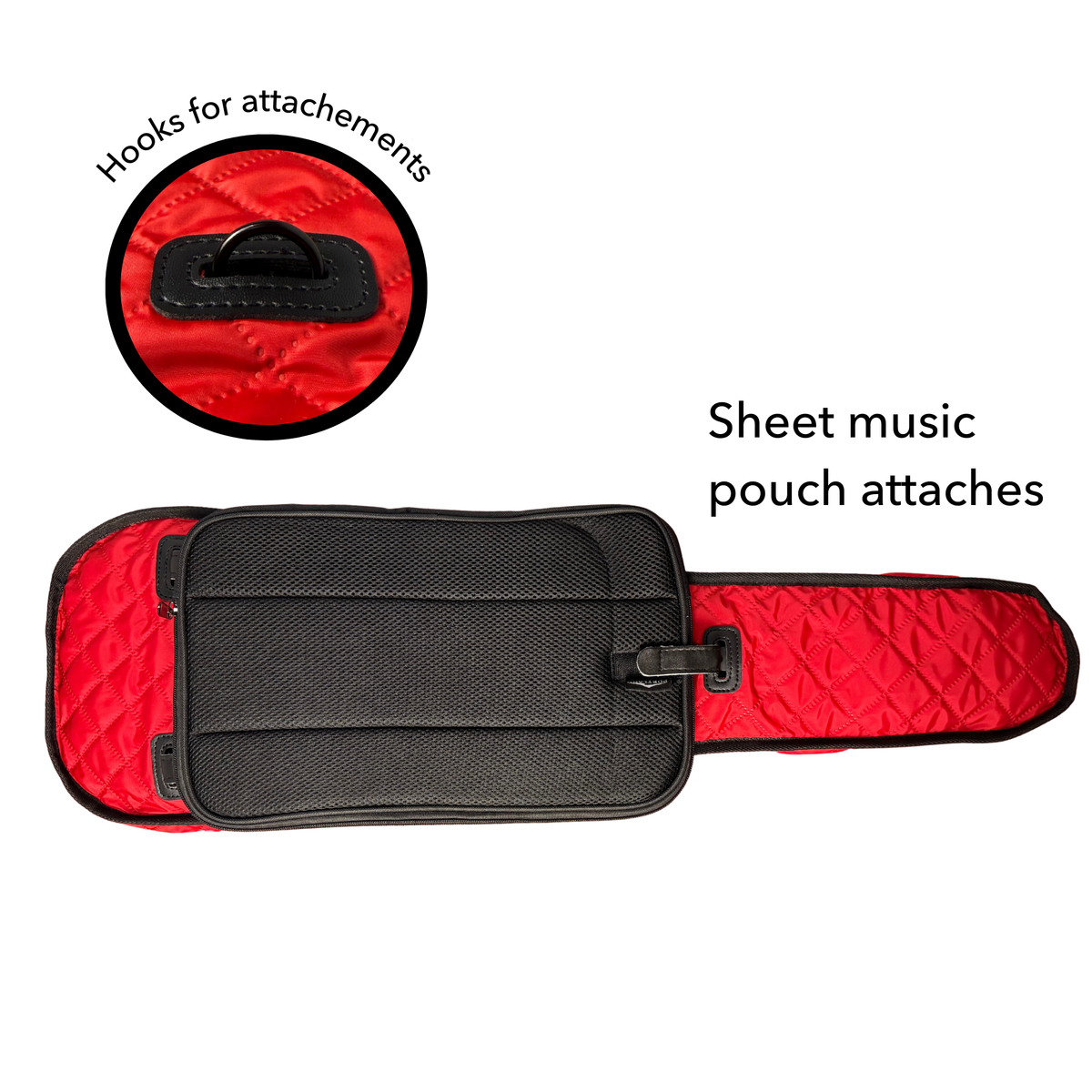 This cover is engineered to work seamlessly with the Portland Shaped Case, featuring reinforced attachment points that allow you to securely connect your sheet music pouch and backpack straps without removing the cover. The result is a fully integrated carrying system that keeps your instrument, music, and accessories organized in one streamlined setup.